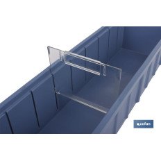Separador transversal para gavetas para mostrador con separadores configurables y topes traseros para fin de carrera. Diseñados para instalaciones automáticas y estanterías de gravedad. Estos separadores Están especialmente indicados para una correcta clasificación de pequeñas piezas, óptimas de almacenaje tipo cajón. Fabricadas en polipropileno de alta resistencia. Evita que se mezclen distintos tipos de material en la gaveta