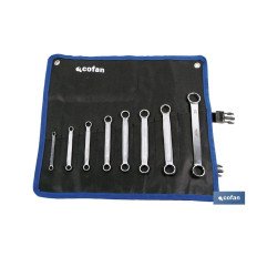 Juegos de llaves estrella plana pulidas, en juegos de 8 piezas. Fabricadas en acero al cromo-vanadio, dándole larga vida, resistencia a la deformación y alta capacidad de esfuerzo. Llaves de doble boca con acabado cromado. Contenido del set de 8 piezas SW 6 x 7, 8 x 9, 10 x 11, 12 x 13, 14 x 15, 16 x 17, 18 x 19 y 21 x 23. Con 12 caras en forma recta y con aristas redondeadas. Llaves forjadas con dos alojamientos hexagonales.
