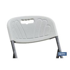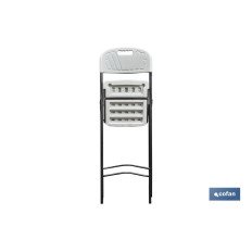Silla alta plegable de color blanco fabricada en polietileno de alta densidad (HDPE) y estructura de acero pintado. Esta silla se ha diseñado para poder utilizarse tanto en interiores como en exteriores. También soporta temperaturas extremas, así como la humedad y los rayos UV, por lo que ofrece resistencia durante todo el año. Su construcción plegable, fácil de abrir y cerrar, permite su almacenamiento con facilidad, ya que ocupa poco espacio cuando no está en uso. Además, tiene un asa integrada en el respaldo que facilita su transporte. Cuenta con travesaños resistentes y articulados para un óptimo almacenaje, así como un asiento y un respaldo de 45 mm de grosor. Su superficie es fácil de limpiar para garantizar la larga vida útil del producto. Ideal para tus momentos al aire libre, así como para eventos, celebraciones o como asiento auxiliar para mesas de jardines, camping, terraza, jardín, trabajos especiales, etc. Medidas cerrada: 143 x 47 x 9 cm. Medidas abierta: altura del asiento de 77 cm y ancho total de 44 cm, con una altura total de 109 cm. Peso neto de 8 kg. Disponible en packs de 2 sillas o en venta unitaria.