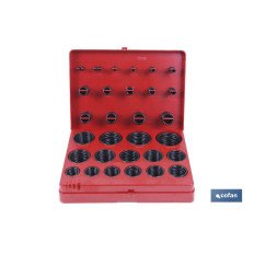 Surtido de 404 Juntas Tóricas de estanqueidad más variedad en nitrilo NBR con medidas en métrico. Total de 30 medidas distintas de anillos tóricos desde 3mm x 2mm hasta 45mm x 4mm. Contiene calibrador de hilo tórico y posibilidad de reposición de las juntas por medidas.