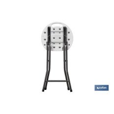 Taburete plegable en color blanco, fabricado con materiales resistentes, fácil de abrir y cerrar, ocupa muy poco espacio cuando se cierra. Fabricado en polietileno (HDPE) de alta densidad y acero. Permite habilitar una zona de descanso de manera casi inmediata. Supone una ventaja en espacios tanto abiertos como cerrados a la hora habilitar zonas de descanso o reposo. Puede ser utilizado para multitud de propósitos y situaciones. Ideal para ambientes de acampada, eventos, excursión, fiestas, celebraciones, comidas, etc.