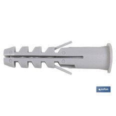 Taco de nylon alado con collarín. Tacos con alas laterales para evitar el giro accidental del taco. Válido para todos los materiales de construcción y seguros durante el montaje gracias a la protección contra el giro. Medidas desde Ø 4 hasta Ø 14 mm. La longitud de fijación reducida garantiza una instalación rápida sin perforaciones profundas. Para materiales de hormigón, rasillas, ladrillos, pladur y bloques de hormigón, paredes macizas, paredes perforadas, cartón yeso, etc. Altos valores de resistencia a la tracción debido a sus zonas de agarre y fijación en la parte central. Especial diseño que evita que el taco sobresalga por fuera de la pared.