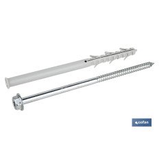 Taco largo de golpe fabricado en poliamida 6.6. con 6 alas y tornillo avellanado hexagonal incluido. Gracias al collarín avellanado, la fijación queda enrasada en el material a fijar. Además, impide que el taco se introduzca por completo en el taladro durante la instalación. La instalación de estos tacos largos es sencilla y desmontable gracias a su rosca y punta arpón. Basta con un golpe de martillo para su instalación. También puede roscarse como un tornillo estándar.Con gran variedad de diámetros y longitudes y amplia flexibilidad en el montaje. Medidas de Ø 10 mm de diámetro y longitudes de 100, 120, 140 y 160 mm.