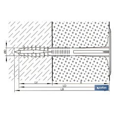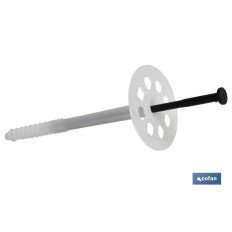 Taco para fijación de paneles aislantes con espiga de fijación de paneles aislantes. Con clavo de nylon y medidas de Ø 10 mm y longitudes hasta 190 mm Especialmente indicado para aplicaciones en materiales compactos semillenos o aligerados de materiales aislantes. Realizar agujero con broca de 8 mm de diámetro, introducir la seta, y golpear el taco para la expansión del soporte. La zona de pre expansión impide que el taco quede rehundido en el material aislante durante la expansión a golpes. Soporte para material aislante de polipropileno con clavo reforzado mediante fibra de vidrio. es perfecto para cualquier aislante incluido todos aquellos resistentes a la presión cómo por ejemplo la lana mineral o el vidrio celular. El montaje a golpes, simple y rápido, reduce el tiempo de trabajo.