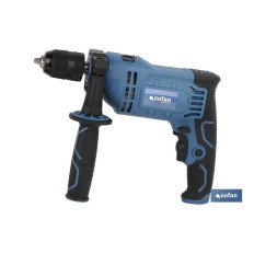 Taladro de impacto 910 W con portabrocas de seguridad automático para brocas de 1-13 mm. Potencia de salida: 0-2800 rpm., 8,6 Nm de par, portabrocas sin llave (automático), 1-13mm, selector de velocidad en gatillo, empuñadura lateral multiposición, peso 2,7 kg. Nº REI-RAEE de Cofan La Mancha: 7038.
