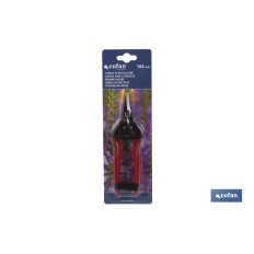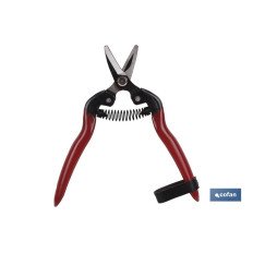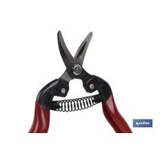 Tijeras de recolección con longitud de 165 mm. Su punta es curvada. Fabricada en acero inoxidable de alta calidad con un alto grado de dureza. Su hoja de corte es rectificada. Su mango cuenta con un diseño ergonómico muy cómodo. Un mantenimiento adecuado alarga la vida de sus herramientas. Precaución: Cuidado con los filos cortantes. Siempre use guantes y protección ocular. Color negro y rojo.