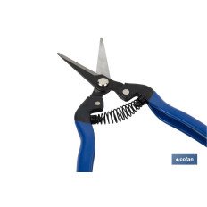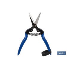 Tijeras de recolección 185 mm de punta curva. Su hoja es de acero, el mango esta bañado en PVC antideslizante y está equipada con un sistema de cierre de seguridad. Este producto es especial para la recolección. Esta herramienta es perfecta para trabajos de acondicionamiento y limpieza en jardinería, agricultura y horticultura. Su filo afilado está totalmente capacitado para realizar tareas de carácter profesional. Su mango es cómodo y no permite el deslizamiento. Su sistema de seguridad ayuda a que las hojas se mantengan afiladas cuando las tijeras no están siendo usadas y evita cortes o lesiones por accidente.