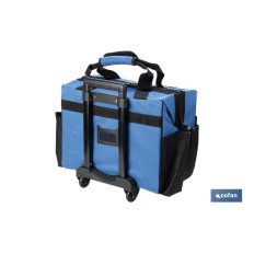 Trolley portaherramientas fabricado en poliéster con gran capacidad de almacenamiento. Esta bolsa de herramientas es la compañera perfecta para que puedas utilizarla en cualquier tipo de trabajo, ya sea profesional o de bricolaje. Lleva contigo las herramientas que necesitas cada día a cualquier parte.Cuenta con 7 bolsillos en su interior, 1 bolsillo con tapa y cierre de velcro en el exterior y 10 bolsillos normales para que puedas ordenar todas tus herramientas y material de trabajo. Incluye un tarjetero de identificación.Está diseñado con 2 ruedas resistentes y dos apoyos delanteros para aportar mayor estabilidad al trolley. El trolley portaherramientas mide 45 x 24 x 42 cm.