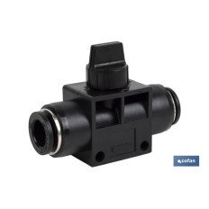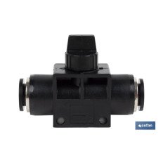 Válvula o grifo de cierre con empalmes rápidos de tubo en ambos lados.