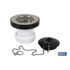 Válvula para lavabo-bidé fabricada en polipropileno de alta calidad. Alta capacidad de desagüe. Incluye tapón fabricado en PVC de alta calidad, tornillo para su perfecta instalación y cadena con dos anillas de longitud 250 mm para ajustar al grifo.